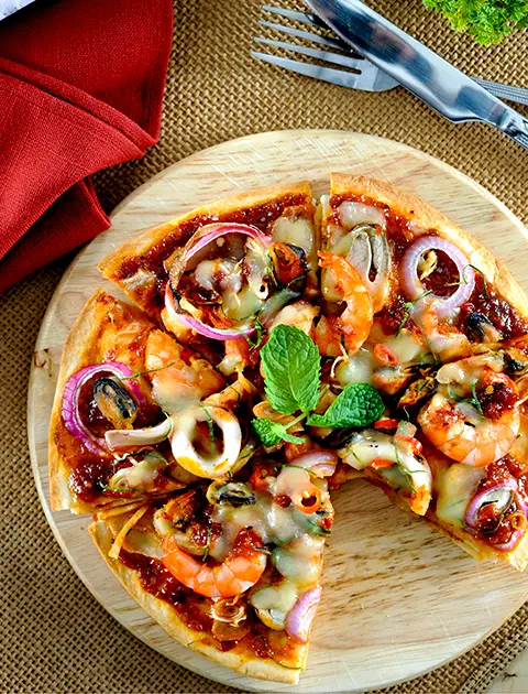 Topped with prawns, mussels, and calamari for a fresh ocean taste. Perfect for seafood lovers craving something unique.