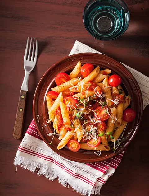 Penne pasta tossed in a spicy tomato sauce with garlic and chilli. A fiery,classic pizza made fresh to order.